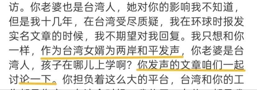 接着话风一转,汪小菲说自己这十几年,在台湾受尽质疑。甚至在环球时报发实名文章的时候,也不期望对自己回复,只想和李亮一样,作为台湾女婿为两岸和平发声。