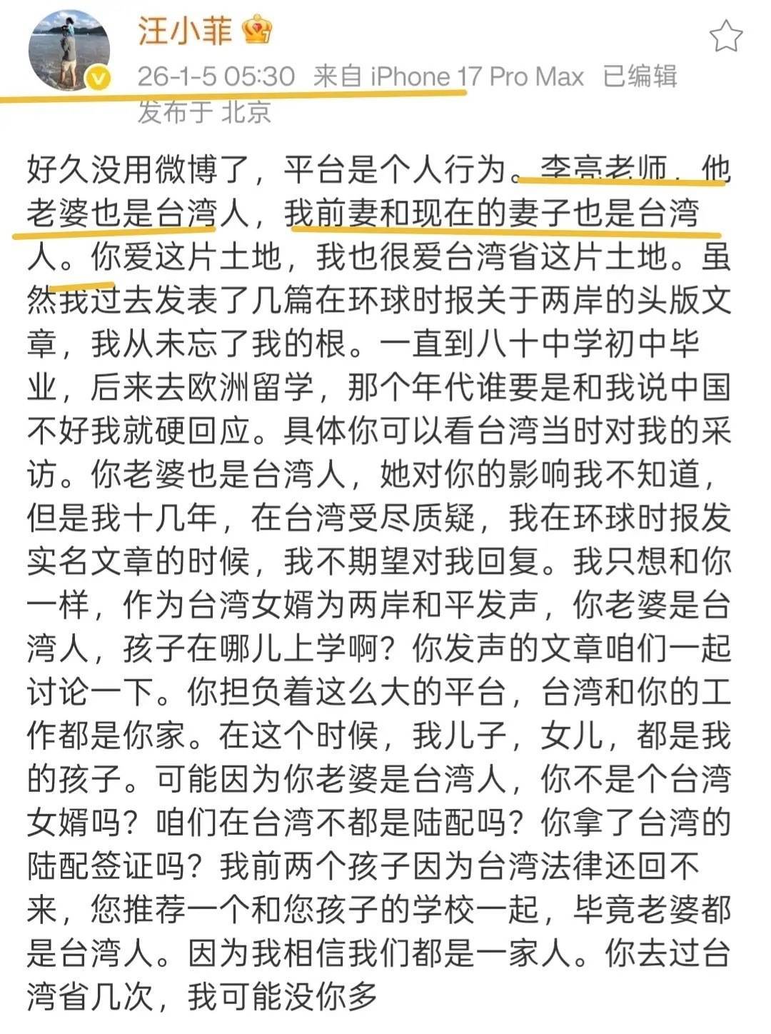 汪小菲喊话李亮老师,他的老婆是台湾人,自己的前妻和现任妻子也是台湾人。你热爱这片土地,我也热爱台湾省这片土地。先把彼此的立场放在一起,因为身份相当所以更能感同身受。