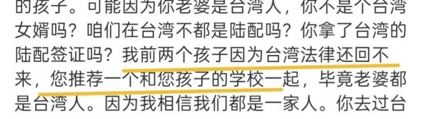 前两个孩子也就是玥儿和霖霖,因为台湾法律还回不来,您推荐一个和您孩子的学校一起。接着汪小菲又说毕竟老婆都是台湾人,我们都是一家人!